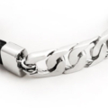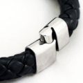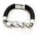 Ανδρικές χειροπέδες με αλυσίδα από χειρουργικό ατσάλι και δέρμα, σε μαύρο και ασημί χρώμα. Για πιο ροκ εμφανίσεις, εκεί που η λεπτομέρεια κάνει τη διαφορά.