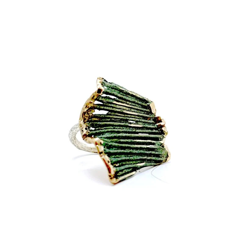 Πτυχώσεις, Χρώμα & Λάμψη Η μοναδικότητα του δαχτυλιδιού έγκειται στον συνδυασμό της κυρτής φόρμας και της ραβδωτής υφής: Κεντρικό Μοτίβο: Ένα μεγάλο, γωνιώδες μοτίβο που καλύπτει το δάχτυλο. Το σχήμα του είναι κυρτό με έντονες, παράλληλες ραβδώσεις σε όλη την επιφάνεια, που θυμίζουν υφή τσαλακωμένου υφάσματος. Υλικό & Φινίρισμα: Ορείχαλκος (Bronze) με πλούσιο, λαμπερό χρυσό φινίρισμα. Οι εσοχές ανάμεσα στις ραβδώσεις έχουν τονιστεί με σκούρα πατίνα, δημιουργώντας μια δραματική αντίθεση που εστιάζει το βλέμμα.