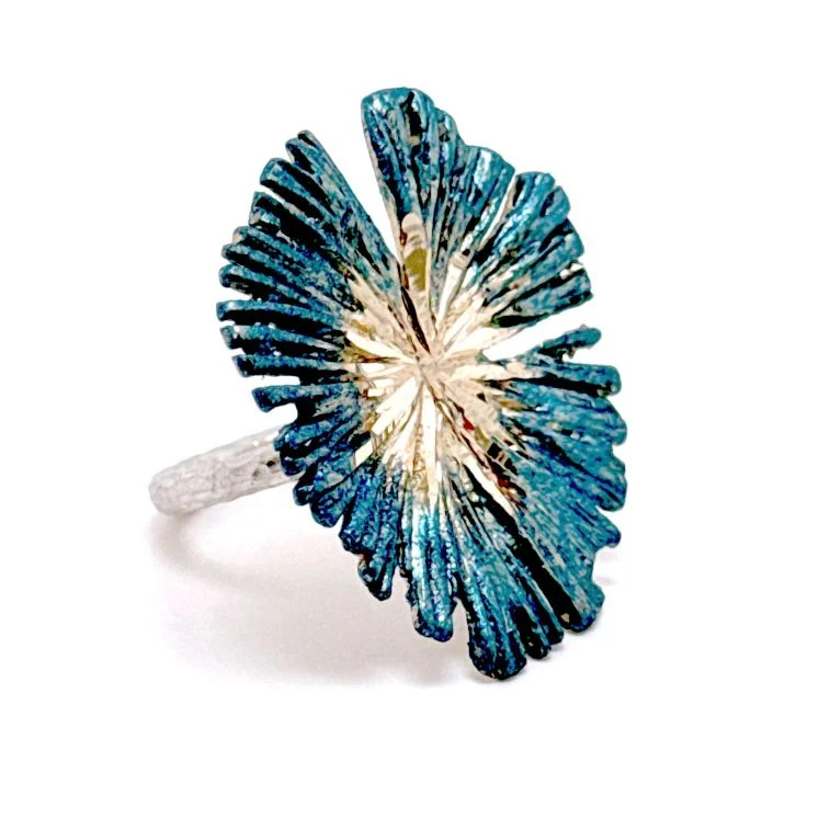 Η ομορφιά αυτού του statement δαχτυλιδιού βρίσκεται στην έντονη αντίθεση υφών και χρωμάτων, καθώς και στη δεξιοτεχνία της κατασκευής: