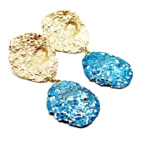 Τα σκουλαρίκια Dark Romance S1148 double είναι εντυπωσιακά, χειροποίητα κρεμαστά από το εργαστήρι της Tina Kotsoni, σχεδιασμένα για ένα τολμηρό statement. Αποτελούνται από δύο ενωμένα μοτίβα σε σχήμα ακανόνιστου βότσαλου, φτιαγμένα από ορείχαλκο. Τα μοτίβα έχουν έντονη, σφυρήλατη υφή και ξεχωρίζουν με τη δίχρωμη επεξεργασία: το άνω τμήμα είναι λαμπερό χρυσό, ενώ το κάτω καλύπτεται από έντονη χρωματιστή πατίνα. Είναι κομμένα με διαμάντι (Diamond Cut) και διαθέτουν ασημένιο καρφάκι 925.