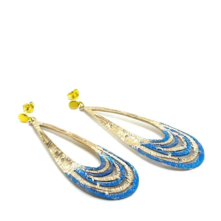 Κατασκευασμένο από υψηλής ποιότητας ορείχαλκο, το σκουλαρίκι διατίθεται σε μια παλέτα φυσικών και έντονων αποχρώσεων: πορτοκαλί, καφέ, μπλε και μέντα — για να επιλέξετε αυτή που εκφράζει το προσωπικό σας στυλ.